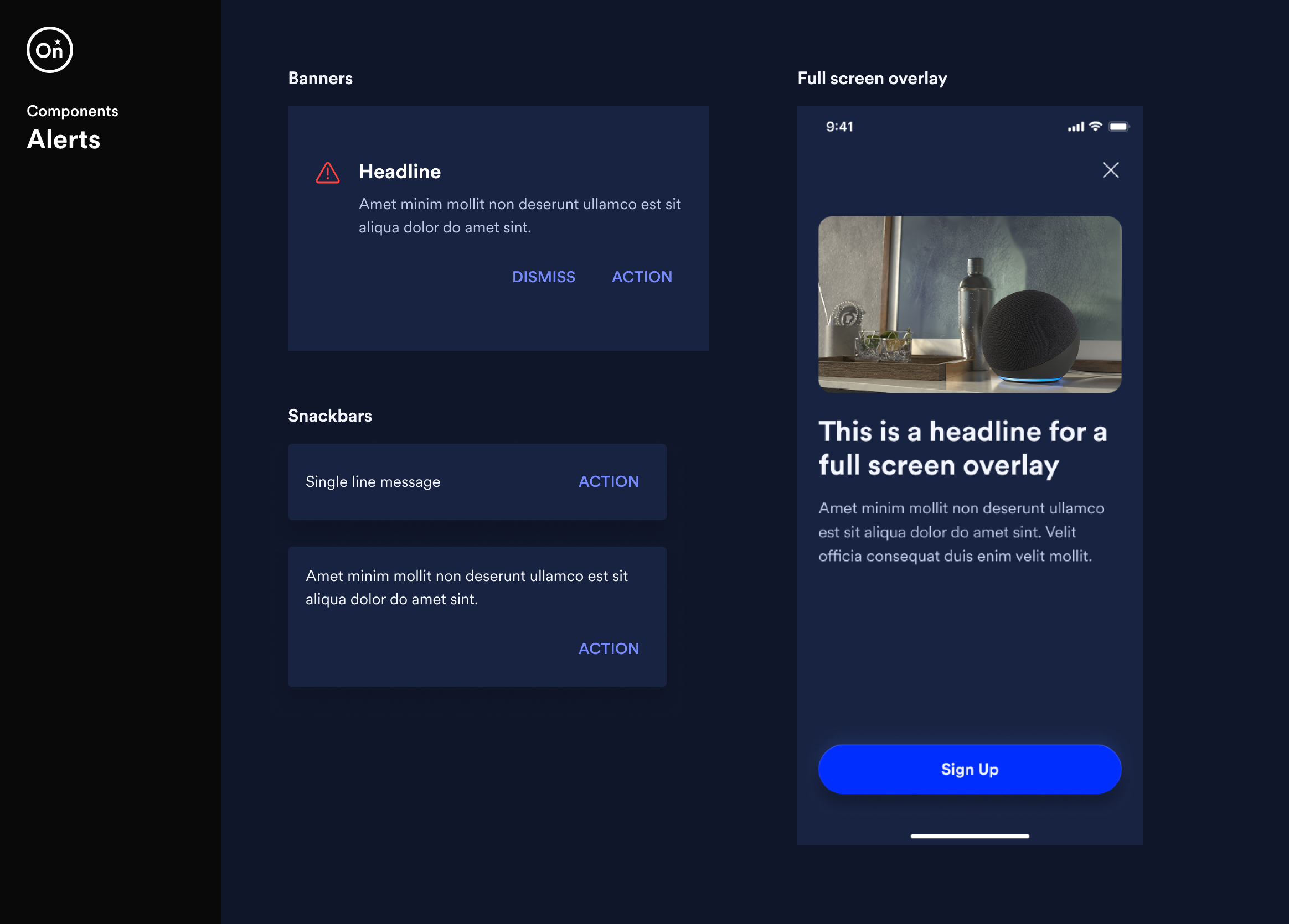 Alert components communicate important information and system feedback to users at varying levels of urgency. The system includes banners, snackbars, and full-screen overlays, allowing messages to be delivered in ways that range from subtle notifications to more prominent interruptions when user attention is required.